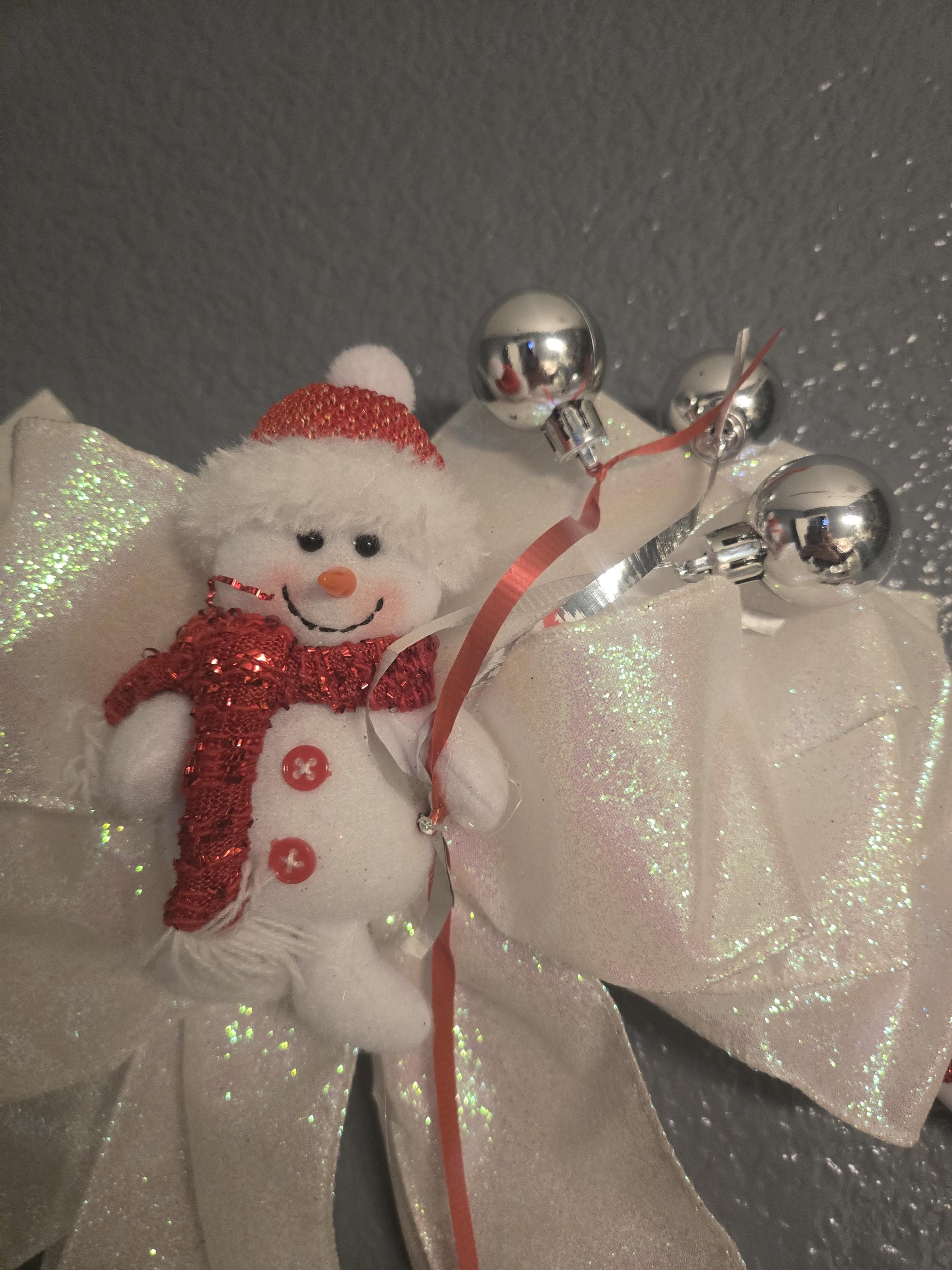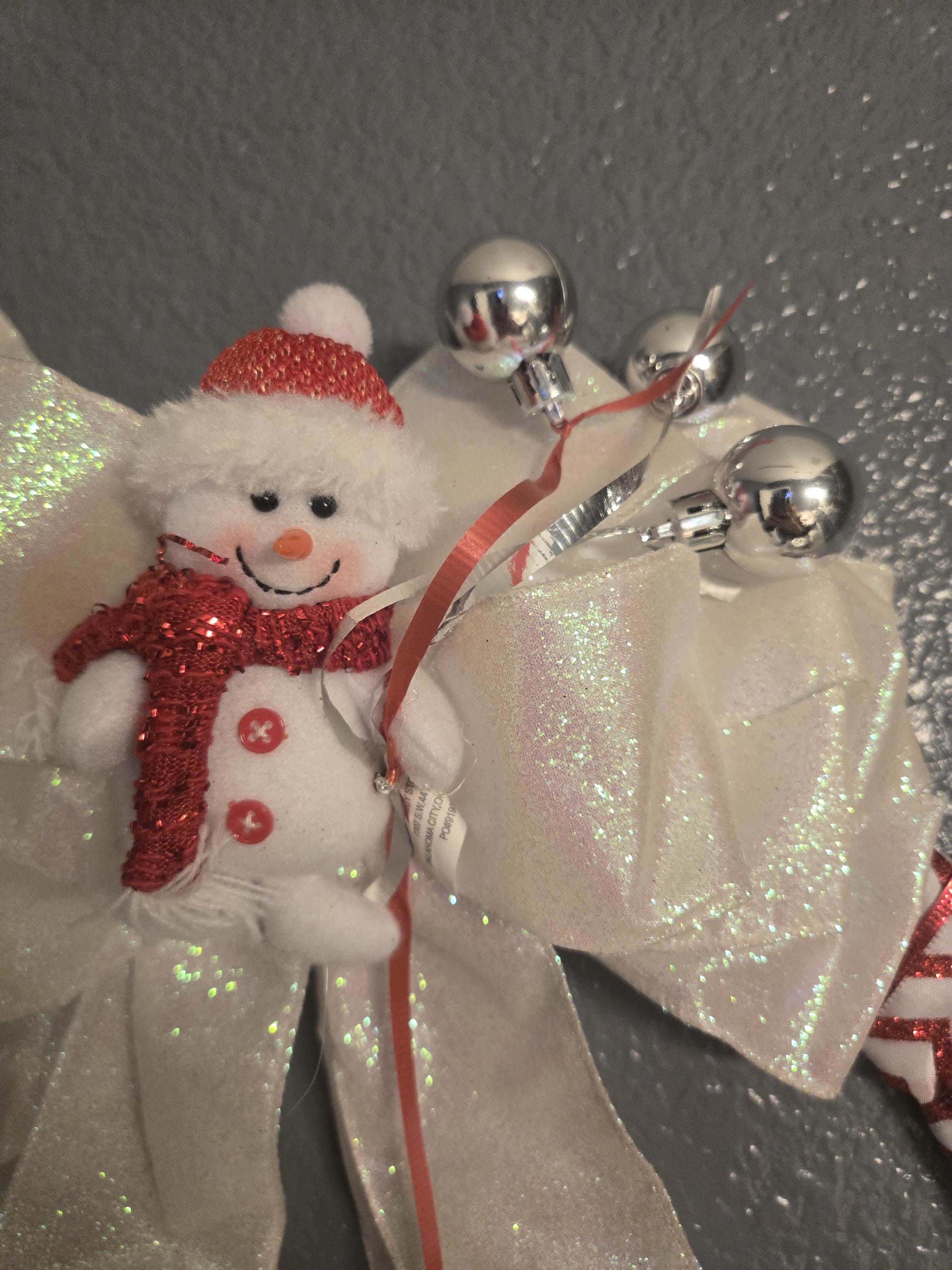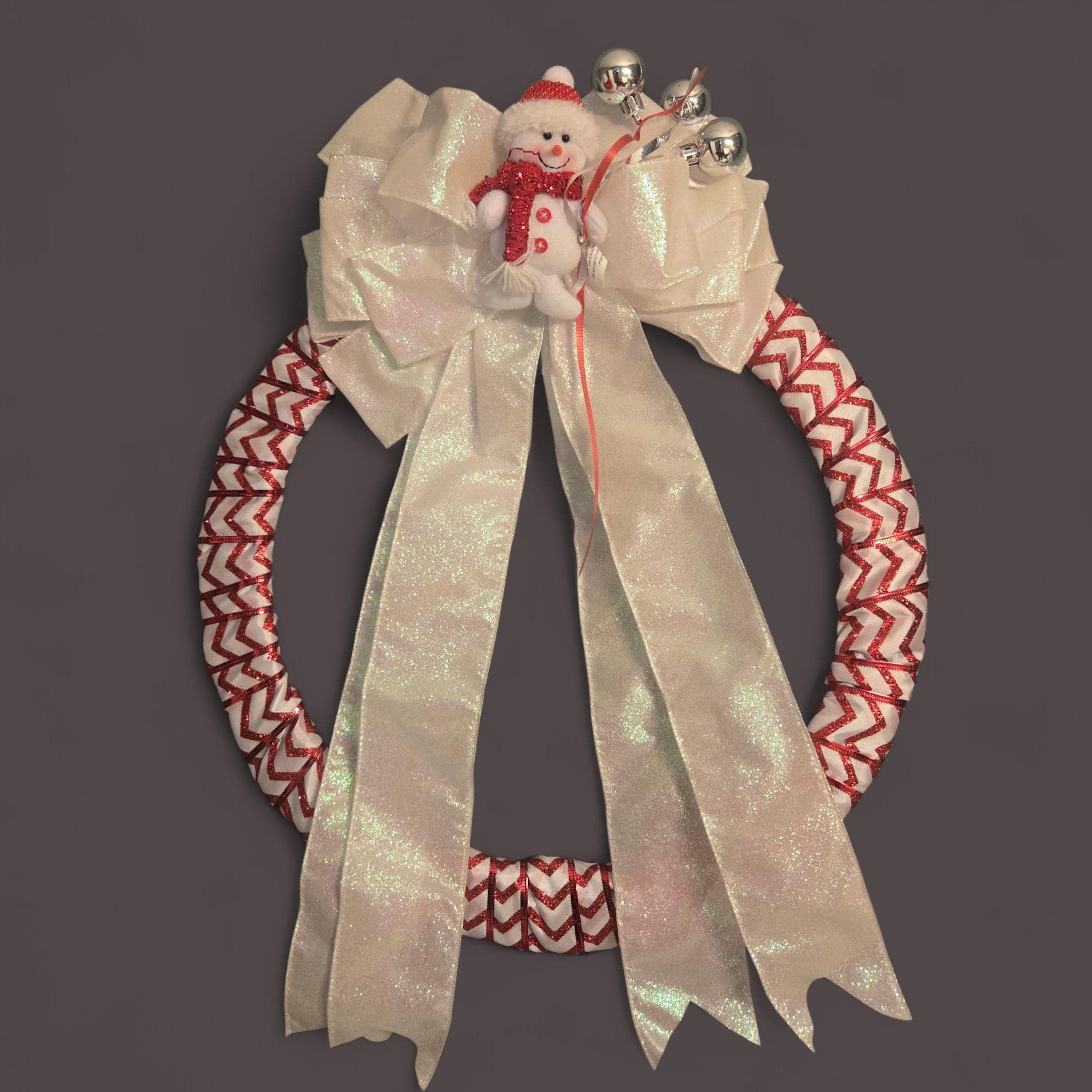 This adorable white and red chevron Ribbon Wreath features a plush snowman figure holding "balloon" ornaments. the ribbon adds a little sheer and sparkle! A great gift or addition to match your holiday decor! This wreath has a 16 inch frame.