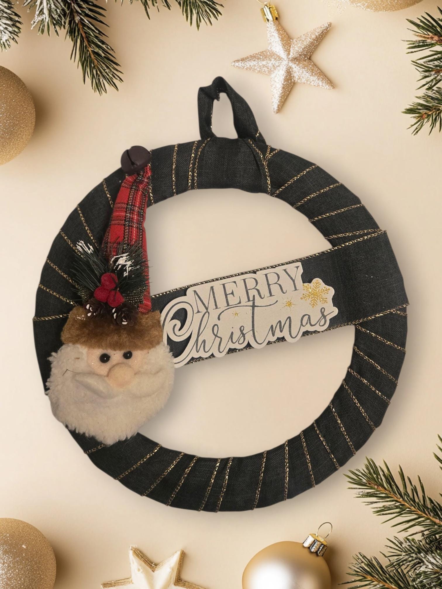 This Green and Gold Ribbon Wreath features a plush santa figure and Merry Christmas sign. A great gift or addition to match your holiday decor! This wreath has a 12 inch frame.