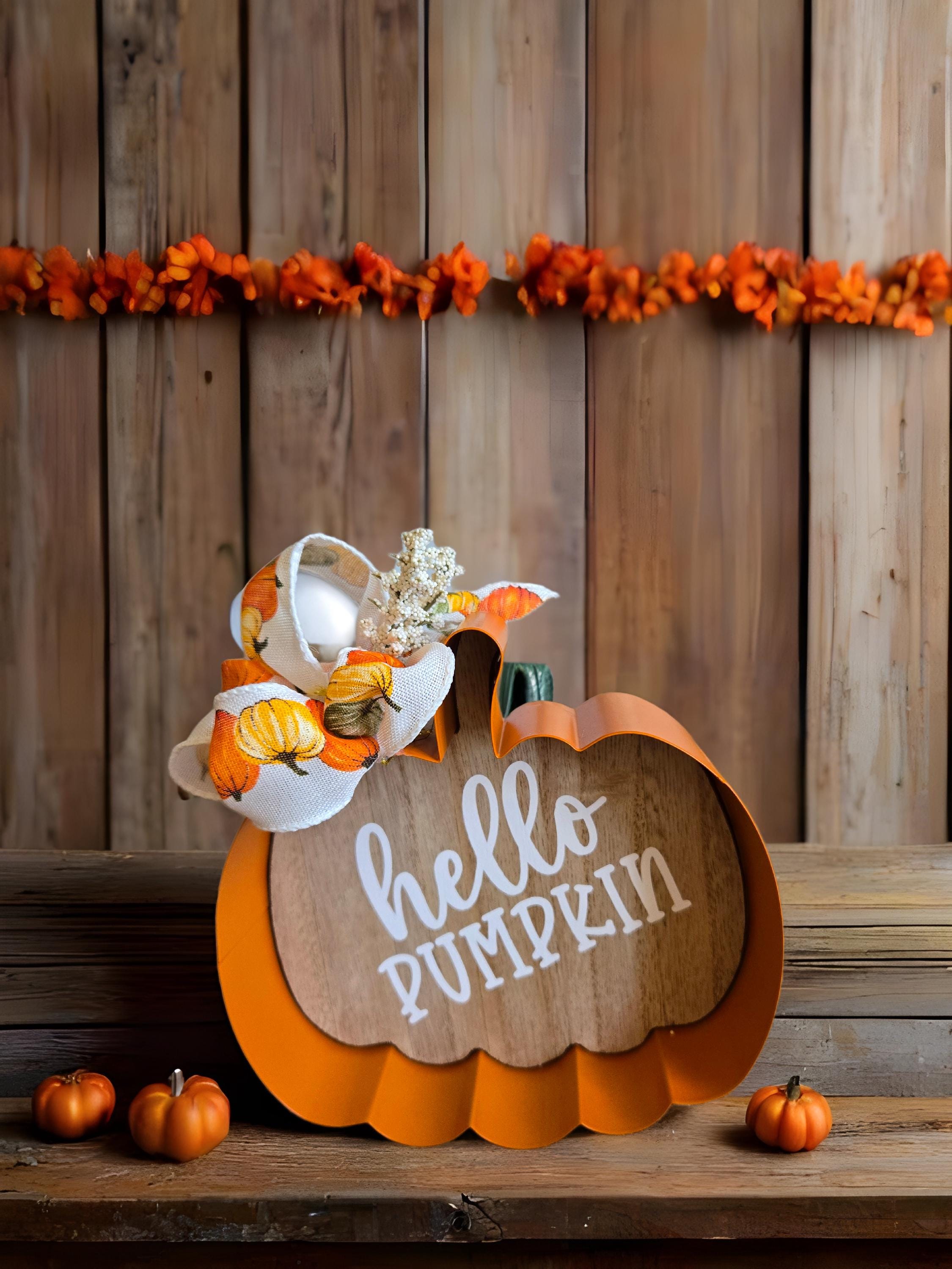 Spice up your Fall decor with this adorable table top Metal Pumpkin! Made from Metal, Wood, Vinyl, Ribbon and Artificial Flowers this little cutie is sure to brighten your day!